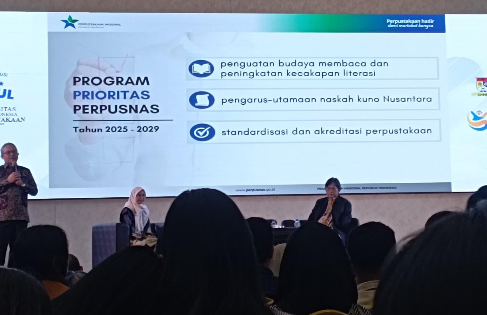 Keduanya memberikan wawasan mendalam mengenai pentingnya membangun citra pustakawan yang kuat di era digital, sekaligus menyoroti peran strategis perpustakaan dalam penguatan literasi masyarakat. Dalam paparan Prof. Aminudin Aziz, turut dijelaskan tiga program prioritas Perpustakaan Nasional RI tahun 2025–2029, yakni: