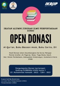 Ikatan Alumni Prodi Ilmu Perpustakaan atau Ikatan Alumni Jurusan Ilmu Perputakaan (IKAJIP) UIN Sumatera Utara Medan melakukan kegiatan Pengabdian Masyarakat ke wilayah Simalungun tepatnya di Jln. Tigaras Desa Togu Domu Nauli, Kec. Dolok Pardamean, Kab. Simalungun. Kegiatan ini diawali dengan proses open donasi yang diselenggarakan oleh pengurus ikatan alumni dengan menyebar flyer di media sosial. Kemudian hasil donasi yang terkumpul diseleksi oleh ketua Ikatan Alumni Muhammad Aditya, S.IP beserta anggota pengurus lainnya.